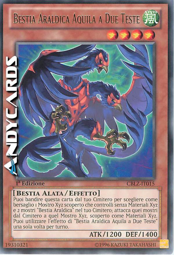 Puoi bandire questa carta dal tuo Cimitero per scegliere come bersaglio 1 Mostro Xyz scoperto che controlli senza Materiali Xyz e 2 mostri "Bestia Araldica" nel tuo Cimitero; attacca quei mostri dal Cimitero a quel Mostro Xyz scoperto, come Materiali Xyz. Puoi utilizzare l'effetto di "Bestia Araldica Aquila a Due Teste" una sola volta per turno.