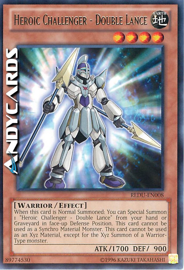 When this card is Normal Summoned: You can Special Summon 1 "Heroic Challenger - Double Lance" from your hand or Graveyard in face-up Defense Position. This card cannot be used as a Synchro Material Monster. This card cannot be used as an Xyz Material, except for the Xyz Summon of a Warrior-Type monster.