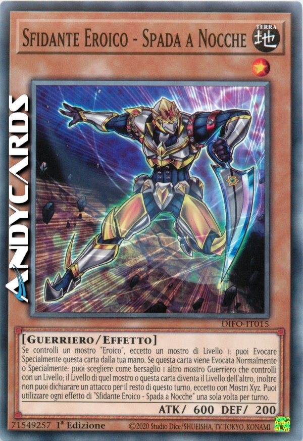 Se controlli un mostro "Eroico", eccetto un mostro di Livello 1: puoi Evocare Specialmente questa carta dalla tua mano. Se questa carta viene Evocata Normalmente o Specialmente: puoi scegliere come bersaglio 1 altro mostro Guerriero che controlli con un Livello; il Livello di quel mostro o questa carta diventa il Livello dell'altro, inoltre non puoi dichiarare un attacco per il resto di questo turno, eccetto con Mostri Xyz. Puoi utilizzare ogni effetto di "Sfidante Eroico - Spada a Nocche" una sola volta per turno.