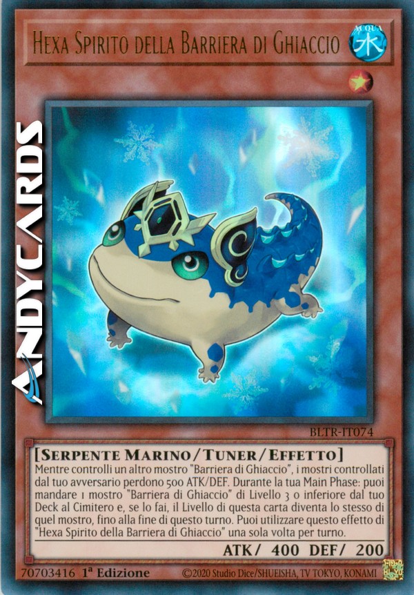 Mentre controlli un altro mostro "Barriera di Ghiaccio", i mostri controllati dal tuo avversario perdono 500 ATK/DEF. Durante la tua Main Phase: puoi mandare 1 mostro "Barriera di Ghiaccio" di Livello 3 o inferiore dal tuo Deck al Cimitero e, se lo fai, il Livello di questa carta diventa lo stesso di quel mostro, fino alla fine di questo turno. Puoi utilizzare questo effetto di "Hexa Spirito della Barriera di Ghiaccio" una sola volta per turno.