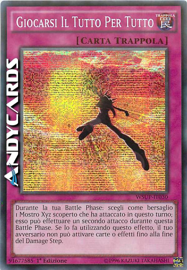 Durante la tua Battle Phase: scegli come bersaglio 1 Mostro Xyz scoperto che ha attaccato in questo turno; esso può effettuare un secondo attacco durante questa Battle Phase. Se lo fa utilizzando questo effetto, il tuo avversario non può attivare carte o effetti fino alla fine del Damage Step.