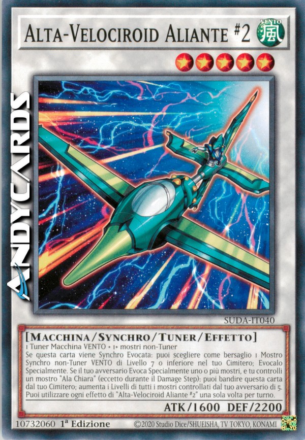 Se questa carta viene Synchro Evocata: puoi scegliere come bersaglio 1 Mostro Synchro non-Tuner VENTO di Livello 7 o inferiore nel tuo Cimitero; Evocalo Specialmente. Se il tuo avversario Evoca Specialmente uno o più mostri, e tu controlli un mostro "Ala Chiara" (eccetto durante il Damage Step): puoi bandire questa carta dal tuo Cimitero; aumenta i Livelli di tutti i mostri controllati dal tuo avversario di 5. Puoi utilizzare ogni effetto di "Alta-Velociroid Aliante #2" una sola volta per turno.