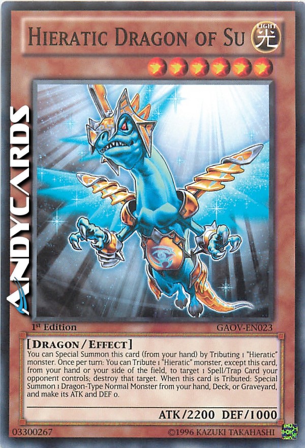 You can Special Summon this card (from your hand) by Tributing 1 "Hieratic" monster. Once per turn: You can Tribute 1 "Hieratic" monster, except this card, from your hand or your side of the field, to target 1 Spell/Trap Card your opponent controls; destroy that target. When this card is Tributed: Special Summon 1 Dragon-Type Normal Monster from your hand, Deck, or Graveyard, and make its ATK and DEF 0.
