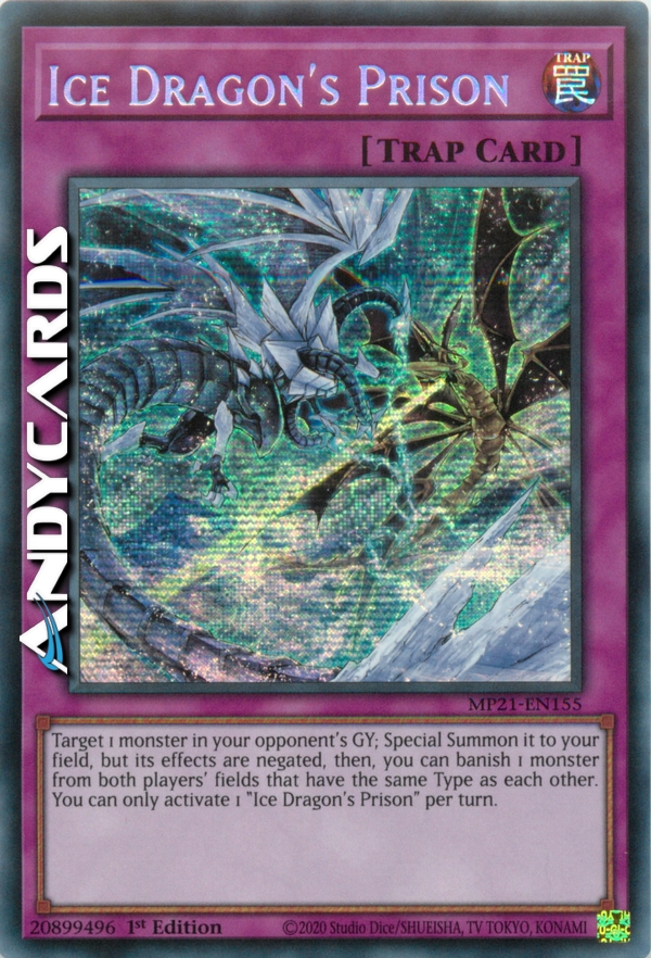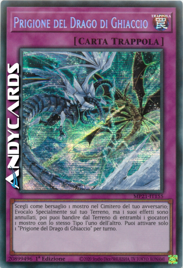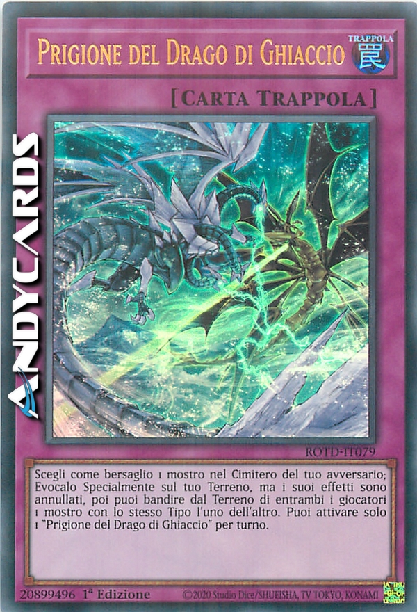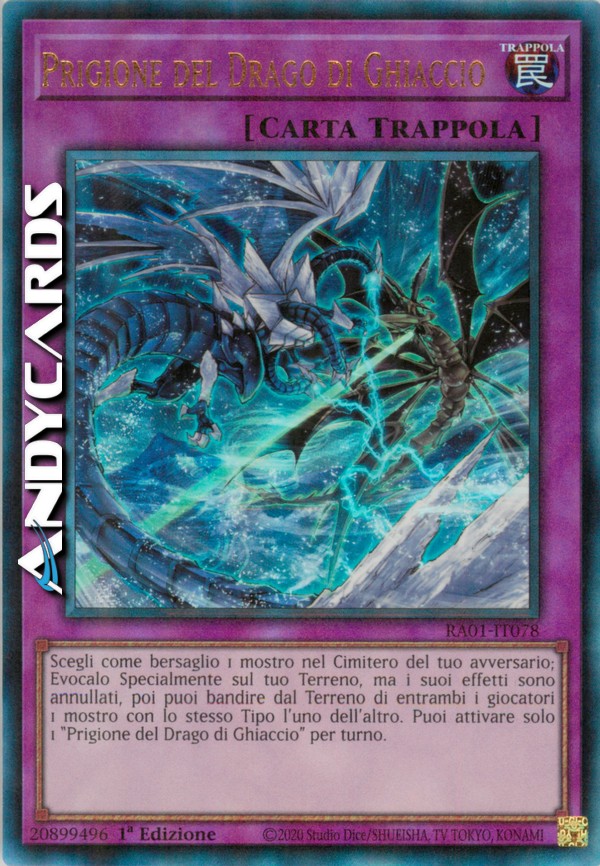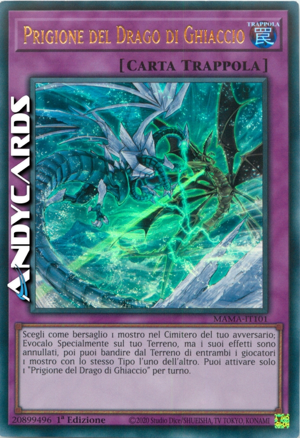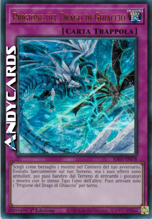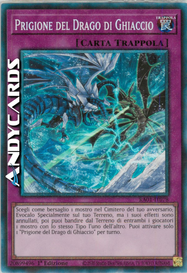 Scegli come bersaglio 1 mostro nel Cimitero del tuo avversario; Evocalo Specialmente sul tuo Terreno, ma i suoi effetti sono annullati, poi puoi bandire dal Terreno di entrambi i giocatori 1 mostro con lo stesso Tipo l'uno dell'altro. Puoi attivare solo 1 "Prigione del Drago di Ghiaccio" per turno.