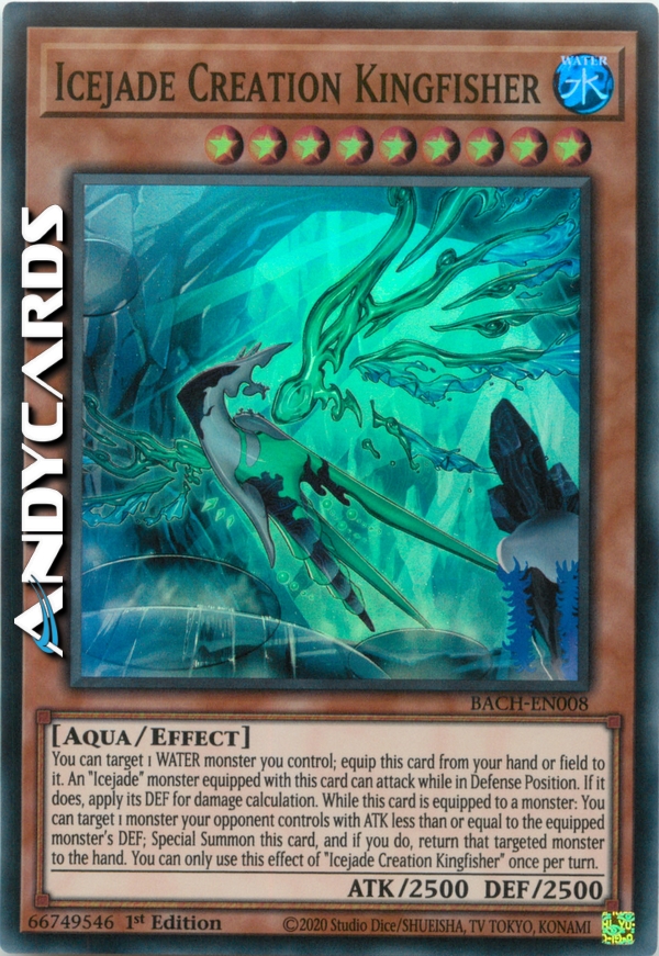 You can target 1 WATER monster you control; equip this card from your hand or field to it. An "Icejade" monster equipped with this card can attack while in Defense Position. If it does, apply its DEF for damage calculation. While this card is equipped to a monster: You can target 1 monster your opponent controls with ATK less than or equal to the equipped monster's DEF; Special Summon this card, and if you do, return that targeted monster to the hand. You can only use this effect of "Icejade Creation Kingfisher" once per turn.