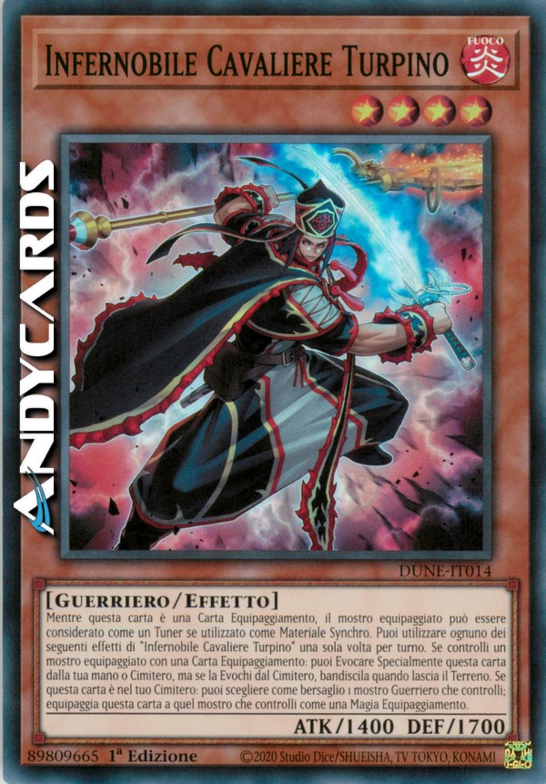 Mentre questa carta è una Carta Equipaggiamento, il mostro equipaggiato può essere considerato come un Tuner se utilizzato come Materiale Synchro. Puoi utilizzare ognuno dei seguenti effetti di "Infernobile Cavaliere Turpino" una sola volta per turno. Se controlli un mostro equipaggiato con una Carta Equipaggiamento: puoi Evocare Specialmente questa carta dalla tua mano o Cimitero, ma se la Evochi dal Cimitero, bandiscila quando lascia il Terreno. Se questa carta è nel tuo Cimitero: puoi scegliere come bersaglio 1 mostro Guerriero che controlli; equipaggia questa carta a quel mostro che controlli come una Magia Equipaggiamento.