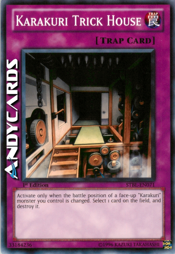 Attiva solo quando la posizione di un mostro "Karakuri" scoperto che controlli viene cambiata. Scegli 1 carta sul Terreno e distruggila.