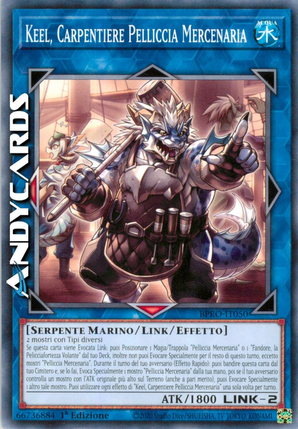 Se questa carta viene Evocata Link: puoi Posizionare 1 Magia/Trappola "Pelliccia Mercenaria" o 1 "Fandore, la Pelicciafortezza Volante" dal tuo Deck, inoltre non puoi Evocare Specialmente per il resto di questo turno, eccetto mostri "Pelliccia Mercenaria". Durante il turno del tuo avversario (Effetto Rapido): puoi bandire questa carta dal tuo Cimitero e, se lo fai, Evoca Specialmente 1 mostro "Pelliccia Mercenaria" dalla tua mano, poi se il tuo avversario controlla un mostro con l'ATK originale più alto sul Terreno (anche a pari merito), puoi Evocare Specialmente 1 altro tale mostro. Puoi utilizzare ogni effetto di "Keel, Carpentiere Pelliccia Mercenaria" una sola volta per turno.