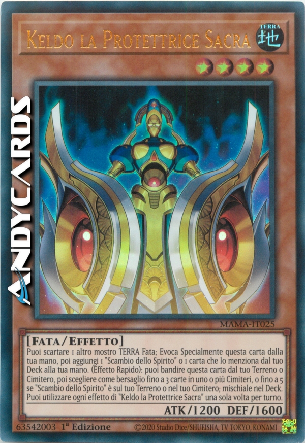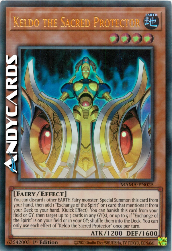 Puoi scartare 1 altro mostro TERRA Fata; Evoca Specialmente questa carta dalla tua mano, poi aggiungi 1 "Scambio dello Spirito" o 1 carta che lo menziona dal tuo Deck alla tua mano. (Effetto Rapido): puoi bandire questa carta dal tuo Terreno o Cimitero, poi scegliere come bersaglio fino a 3 carte in uno o più Cimiteri, o fino a 5 se "Scambio dello Spirito" è sul tuo Terreno o nel tuo Cimitero; mischiale nel Deck. Puoi utilizzare ogni effetto di "Keldo la Protettrice Sacra" una sola volta per turno.