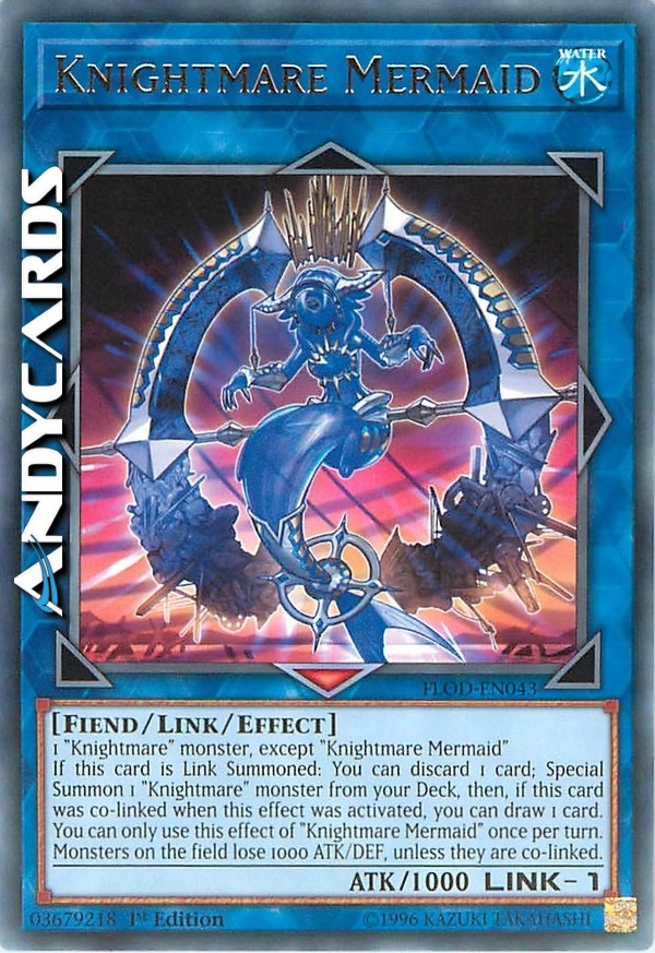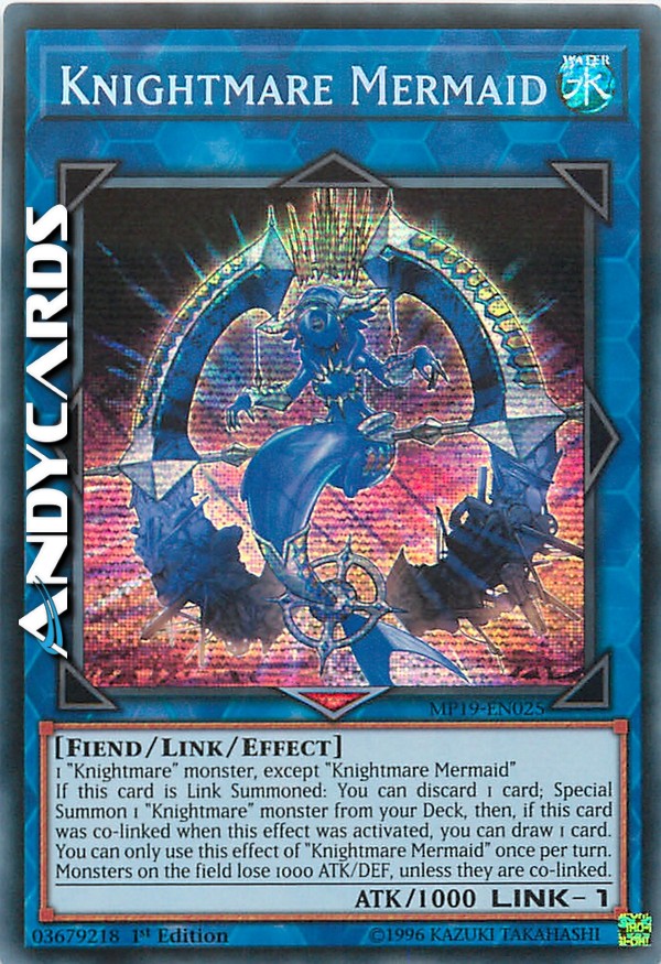 If this card is Link Summoned: You can discard 1 card; Special Summon 1 "Knightmare" monster from your Deck, then, if this card was co-linked when this effect was activated, you can draw 1 card. You can only use this effect of "Knightmare Mermaid" once per turn. Monsters on the field lose 1000 ATK/DEF, unless they are co-linked.