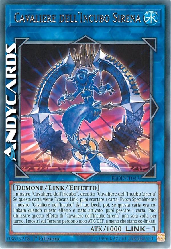 Se questa carta viene Evocata Link: puoi scartare 1 carta; Evoca Specialmente 1 mostro "Cavaliere dell'Incubo" dal tuo Deck, poi, se questa carta era co-linkata quando questo effetto è stato attivato, puoi pescare 1 carta. Puoi utilizzare questo effetto di "Cavaliere dell'Incubo Sirena" una sola volta per turno. I mostri sul Terreno perdono 1000 ATK/DEF, a meno che siano co-linkati.