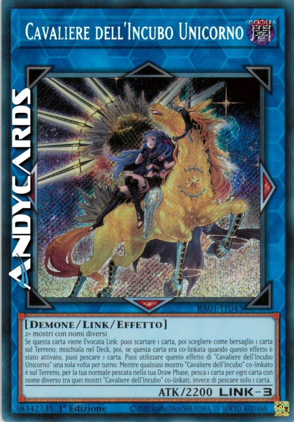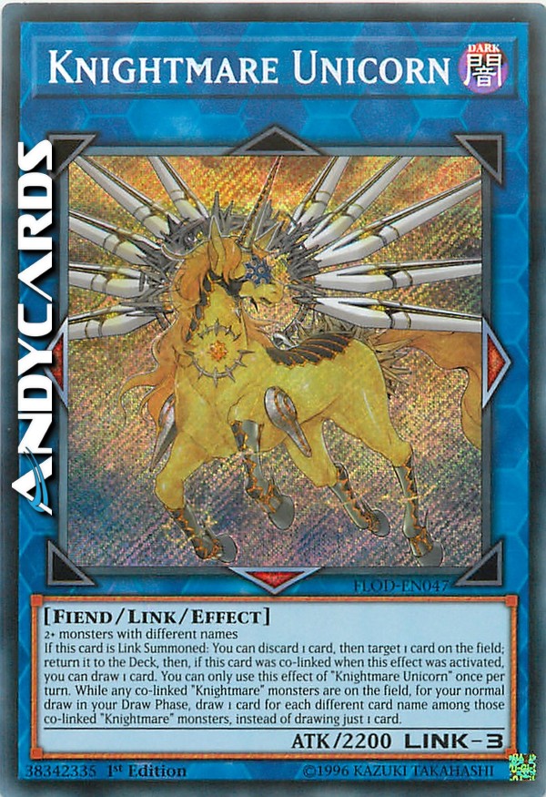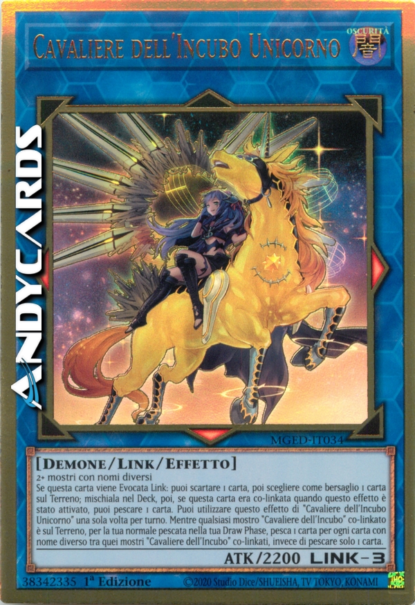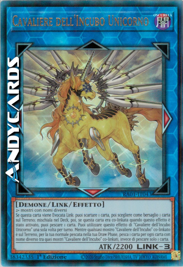 Se questa carta viene Evocata Link: puoi scartare 1 carta, poi scegliere come bersaglio 1 carta sul Terreno; falla ritornare nel Deck, poi, se questa carta era co-linkata quando questo effetto è stato attivato, puoi pescare 1 carta. Puoi utilizzare questo effetto di "Cavaliere dell'Incubo Unicorno" una sola volta per turno. Mentre qualsiasi mostro "Cavaliere dell'Incubo" co-linkato è sul Terreno, per la tua normale pescata nella tua Draw Phase, pesca 1 carta per ogni carta con nome diverso tra quei mostri "Cavaliere dell'Incubo" co-linkati, invece di pescare solo 1 carta.