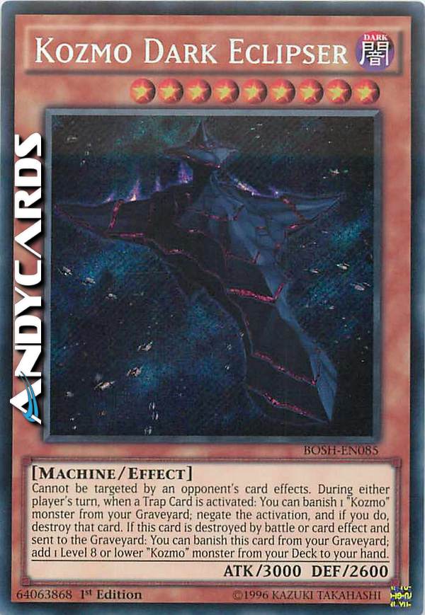 Cannot be targeted by an opponent's card effects. During either player's turn, when a Trap Card is activated: You can banish 1 "Kozmo" monster from your Graveyard; negate the activation, and if you do, destroy that card. If this card is destroyed by battle or card effect and sent to the Graveyard: You can banish this card from your Graveyard; add 1 Level 8 or lower "Kozmo" monster from your Deck to your hand.