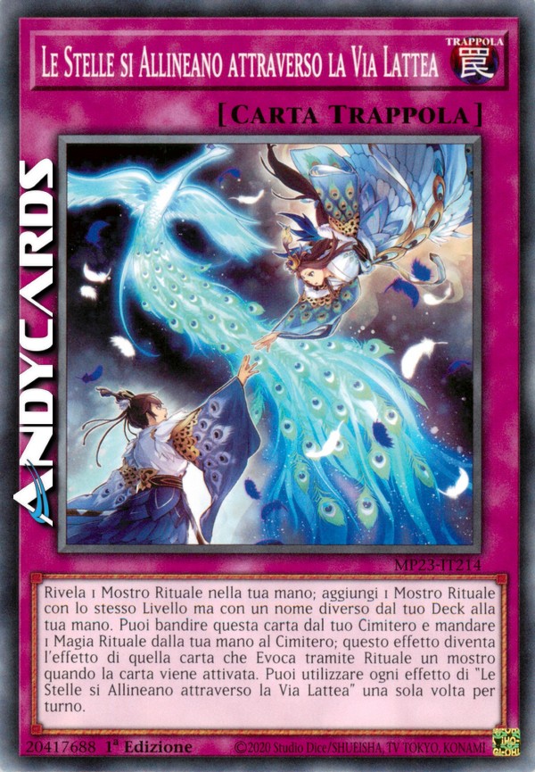 Rivela 1 Mostro Rituale nella tua mano; aggiungi 1 Mostro Rituale con lo stesso Livello ma con un nome diverso dal tuo Deck alla tua mano. Puoi bandire questa carta dal tuo Cimitero e mandare 1 Magia Rituale dalla tua mano al Cimitero; questo effetto diventa l'effetto di quella carta che Evoca tramite Rituale un mostro quando la carta viene attivata. Puoi utilizzare ogni effetto di "Le Stelle si Allineano attraverso la Via Lattea" una sola volta per turno.