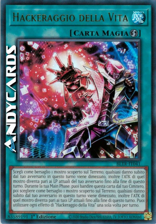 Scegli come bersaglio 1 mostro scoperto sul Terreno; qualsiasi danno subito dal tuo avversario in questo turno viene dimezzato, inoltre l'ATK di quel mostro diventa pari ai LP attuali del tuo avversario fino alla fine di questo turno. Durante la tua Main Phase: puoi bandire questa carta dal tuo Cimitero, poi scegliere come bersaglio 1 mostro scoperto sul Terreno; qualsiasi danno subito dal tuo avversario in questo turno viene dimezzato, inoltre l'ATK di quel mostro diventa pari ai tuoi LP attuali fino alla fine di questo turno. Puoi utilizzare ogni effetto di "Hackeraggio della Vita" una sola volta per turno.