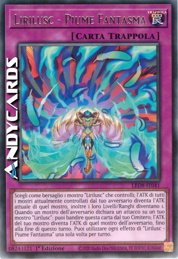 Scegli come bersaglio 1 mostro "Lirilusc" che controlli; l'ATK di tutti i mostri attualmente controllati dal tuo avversario diventa l'ATK attuale di quel mostro, inoltre i loro Livelli/Ranghi diventano 1. Quando un mostro dell'avversario dichiara un attacco su un tuo mostro "Lirilusc": puoi bandire questa carta dal tuo Cimitero; l'ATK del tuo mostro diventa l'ATK di quel mostro dell'avversario, fino alla fine di questo turno. Puoi utilizzare ogni effetto di "Lirilusc - Piume Fantasma" una sola volta per turno.