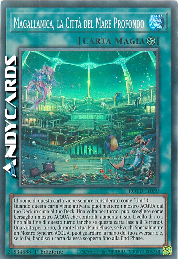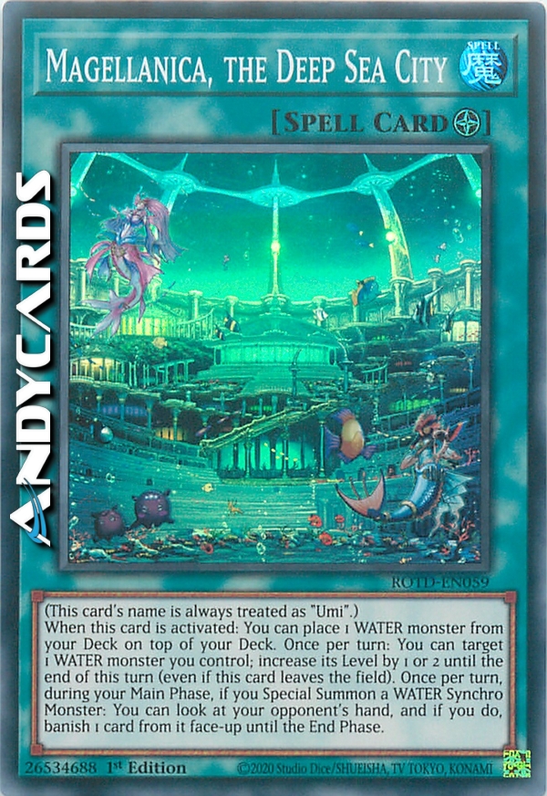 Quando questa carta viene attivata: puoi mettere 1 mostro ACQUA dal tuo Deck in cima al tuo Deck. Una volta per turno: puoi scegliere come bersaglio 1 mostro ACQUA che controlli; aumenta il suo Livello di 1 o 2 fino alla fine di questo turno (anche se questa carta lascia il Terreno). Una volta per turno, durante la tua Main Phase, se Evochi Specialmente un Mostro Synchro ACQUA: puoi guardare la mano del tuo avversario e, se lo fai, bandisci 1 carta da essa scoperta fino alla End Phase.