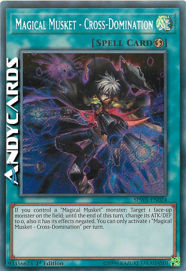 If you control a "Magical Musket" monster: Target 1 face-up monster on the field; until the end of this turn, change its ATK/DEF to 0, also it has its effects negated. You can only activate 1 "Magical Musket - Cross-Domination" per turn.