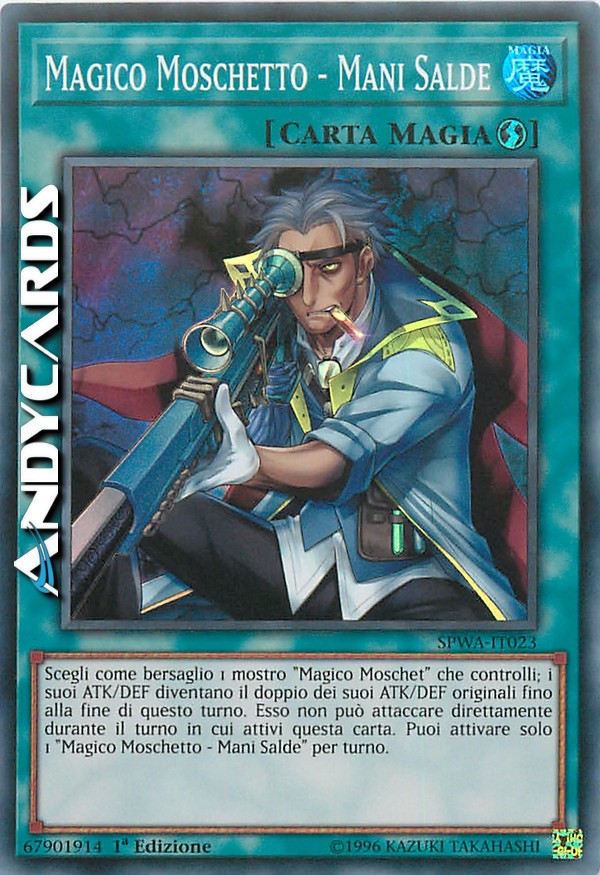 Scegli come bersaglio 1 mostro "Magico Moschet" che controlli; i suoi ATK/DEF diventano il doppio dei suoi ATK/DEF originali fino alla fine di questo turno. Esso non può attaccare direttamente durante il turno in cui attivi questa carta. Puoi attivare solo 1 "Magico Moschetto - Mani Salde" per turno.