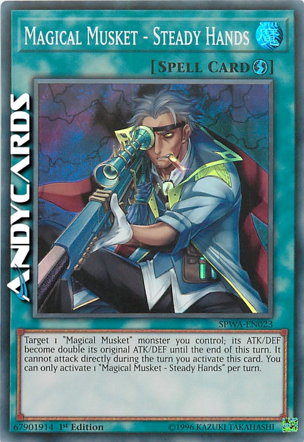 Target 1 "Magical Musket" monster you control; its ATK/DEF become double its original ATK/DEF until the end of this turn. It cannot attack directly during the turn you activate this card. You can only activate 1 "Magical Musket - Steady Hands" per turn.