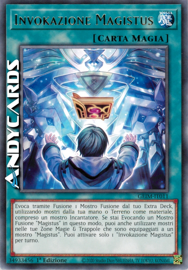 Fusion Summon 1 Fusion Monster from your Extra Deck, using monsters from your hand or field as material, including a Spellcaster monster. If Summoning a "Magistus" Fusion Monster this way, you can also use monsters in your Spell & Trap Zones that are equipped to a "Magistus" monster. You can only activate 1 "Magistus Invocation" per turn.