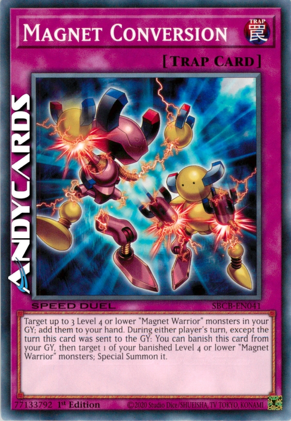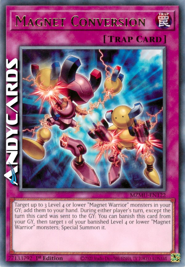 Scegli come bersaglio fino a 3 mostri "Guerriero Magnetico" di Livello 4 o inferiore nel tuo Cimitero; aggiungili alla tua mano. Durante il turno di qualsiasi giocatore, eccetto nel turno in cui questa carta è stata mandata al Cimitero: puoi bandire questa carta dal tuo Cimitero, poi scegliere come bersaglio 1 dei tuoi mostri "Guerriero Magnetico" di Livello 4 o inferiore banditi; Evocalo Specialmente.