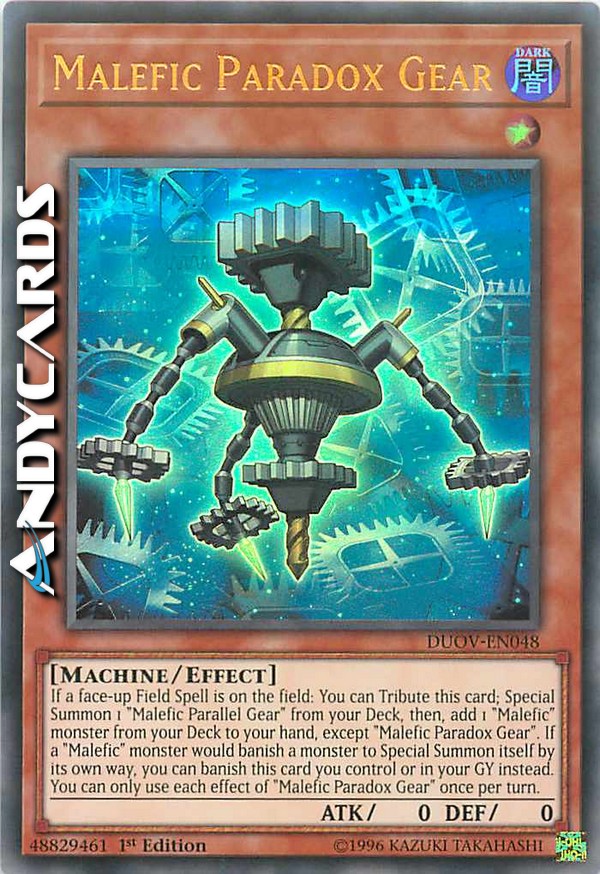 Se sul Terreno c'è una Magia Terreno scoperta: puoi offrire come Tributo questa carta; Evoca Specialmente 1 "Ingranaggio Parallelo Maligno" dal tuo Deck, poi aggiungi 1 mostro "Maligno" dal tuo Deck alla tua mano, eccetto "Ingranaggio Paradosso Maligno". Se un mostro "Maligno" sta per bandire un mostro per Evocare Specialmente se stesso nel suo modo, puoi invece bandire questa carta che controlli o nel tuo Cimitero. Puoi utilizzare ogni effetto di "Ingranaggio Paradosso Maligno" una sola volta per turno.