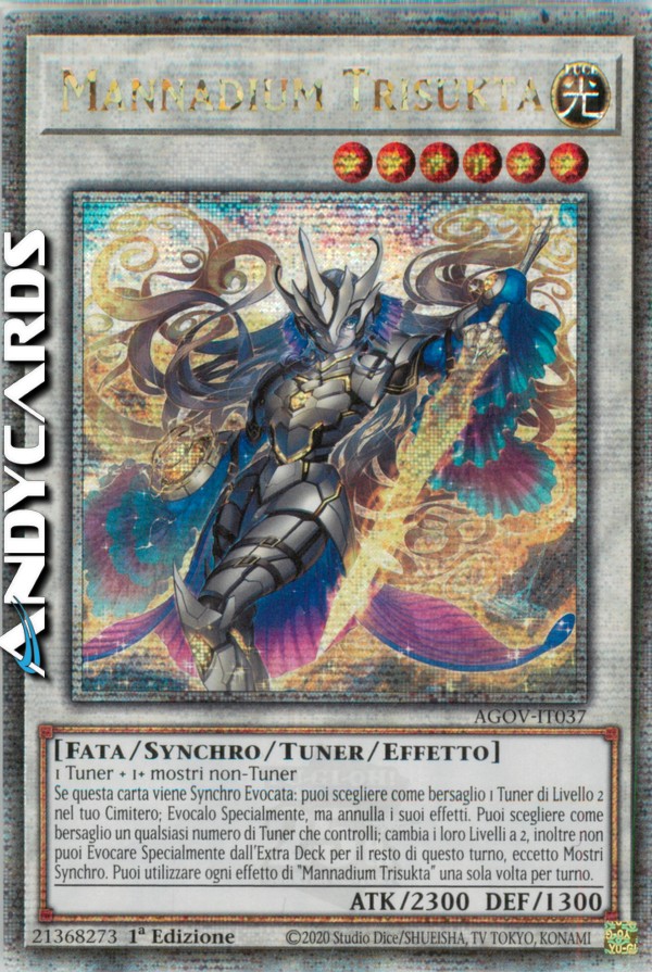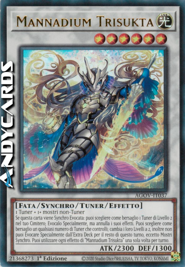 Se questa carta viene Synchro Evocata: puoi scegliere come bersaglio 1 Tuner di Livello 2 nel tuo Cimitero; Evocalo Specialmente, ma annulla i suoi effetti. Puoi scegliere come bersaglio un qualsiasi numero di Tuner che controlli; cambia i loro Livelli a 2, inoltre non puoi Evocare Specialmente dall'Extra Deck per il resto di questo turno, eccetto Mostri Synchro. Puoi utilizzare ogni effetto di "Mannadium Trisukta" una sola volta per turno.