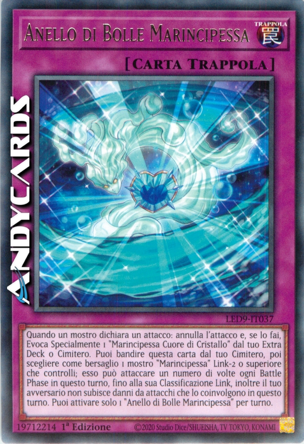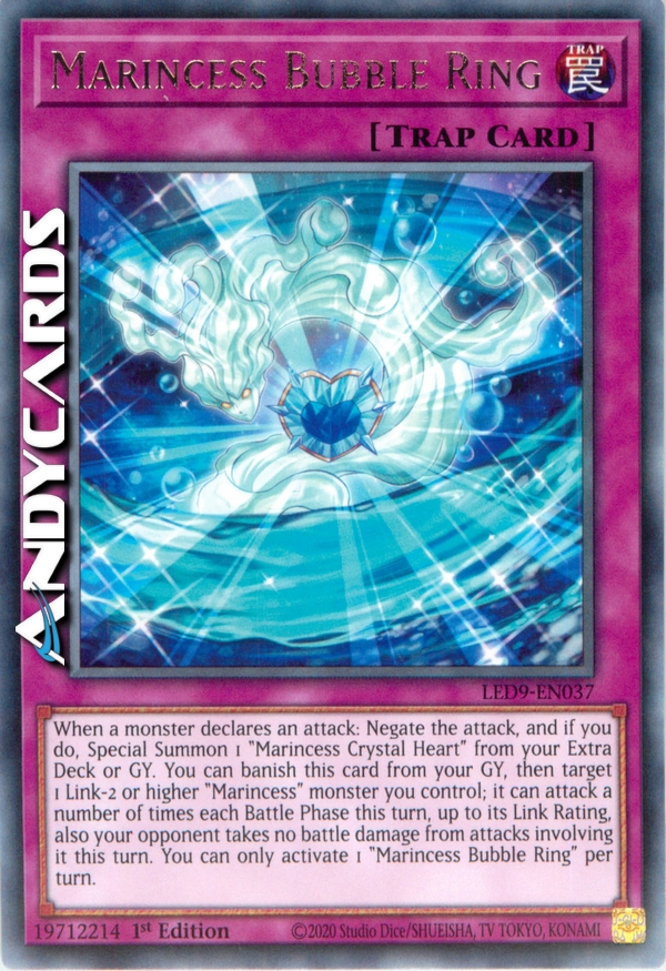 Quando un mostro dichiara un attacco: annulla l'attacco e, se lo fai, Evoca Specialmente 1 "Marincipessa Cuore di Cristallo" dal tuo Extra Deck o Cimitero. Puoi bandire questa carta dal tuo Cimitero, poi scegliere come bersaglio 1 mostro "Marincipessa" Link-2 o superiore che controlli; esso può attaccare un numero di volte ogni Battle Phase in questo turno, fino alla sua Classificazione Link, inoltre il tuo avversario non subisce danni da attacchi che lo coinvolgono in questo turno. Puoi attivare solo 1 "Anello di Bolle Marincipessa" per turno.