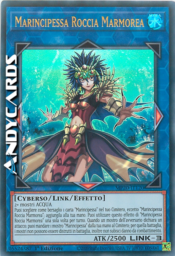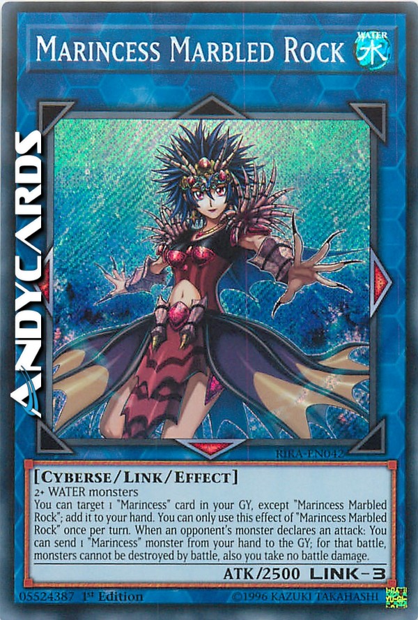 Puoi scegliere come bersaglio 1 carta "Marincipessa" nel tuo Cimitero, eccetto "Marincipessa Roccia Marmorea"; aggiungila alla tua mano. Puoi utilizzare questo effetto di "Marincipessa Roccia Marmorea" una sola volta per turno. Quando un mostro dell'avversario dichiara un attacco: puoi mandare 1 mostro "Marincipessa" dalla tua mano al Cimitero; per quella battaglia, i mostri non possono essere distrutti in battaglia, inoltre non subisci danno da combattimento.