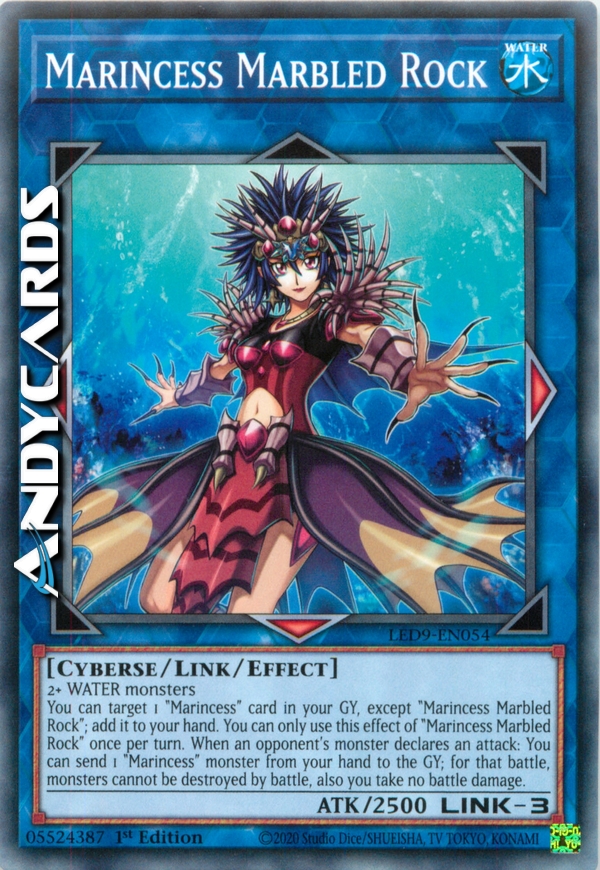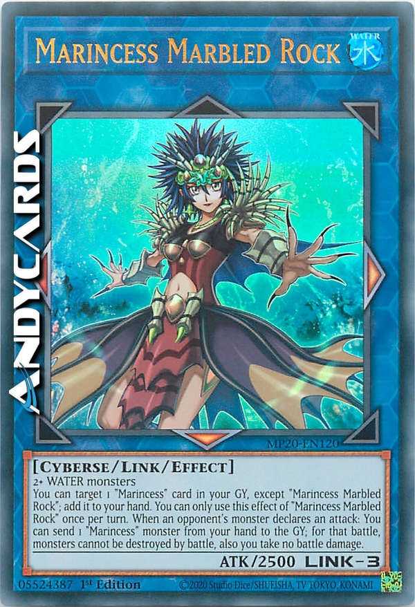 You can target 1 "Marincess" card in your GY, except "Marincess Marbled Rock"; add it to your hand. You can only use this effect of "Marincess Marbled Rock" once per turn. When an opponent's monster declares an attack: You can send 1 "Marincess" monster from your hand to the GY; for that battle, monsters cannot be destroyed by battle, also you take no battle damage.