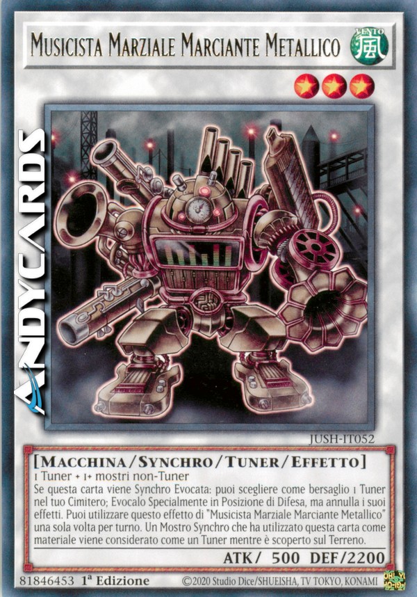 Se questa carta viene Synchro Evocata: puoi scegliere come bersaglio 1 Tuner nel tuo Cimitero; Evocalo Specialmente in Posizione di Difesa, ma annulla i suoi effetti. Puoi utilizzare questo effetto di "Musicista Marziale Marciante Metallico" una sola volta per turno. Un Mostro Synchro che ha utilizzato questa carta come materiale viene considerato come un Tuner mentre è scoperto sul Terreno.