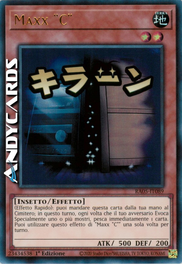 Durante il turno di qualsiasi giocatore: puoi mandare questa carta dalla tua mano al Cimitero; in questo turno, ogni volta che il tuo avversario Evoca Specialmente uno o più mostri, pesca immediatamente 1 carta. Puoi utilizzare solo 1 "Maxx "C"" per turno.