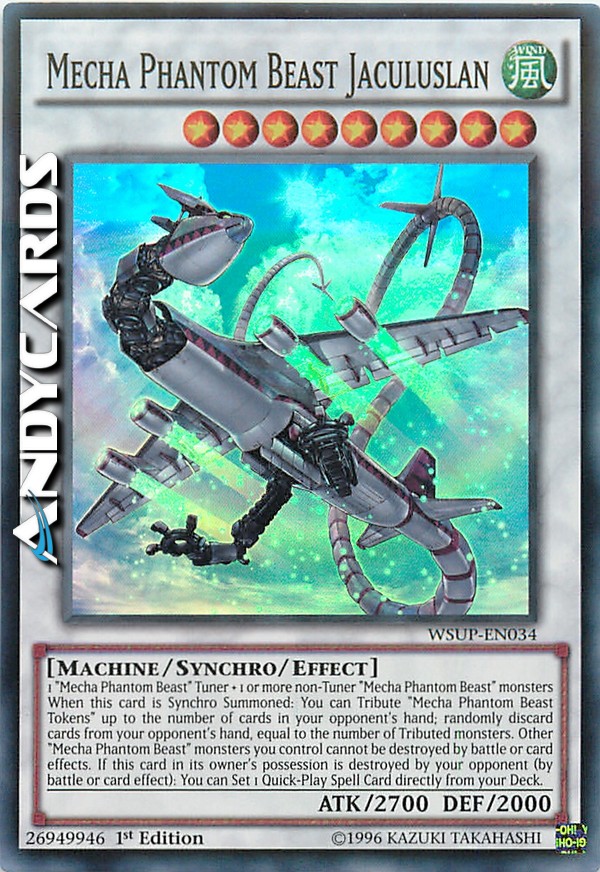 1 "Mecha Phantom Beast" Tuner + 1 or more non-Tuner "Mecha Phantom Beast" monsters - When this card is Synchro Summoned: You can Tribute "Mecha Phantom Beast Tokens" up to the number of cards in your opponent's hand; randomly discard cards from your opponent's hand, equal to the number of Tributed monsters. Other "Mecha Phantom Beast" monsters you control cannot be destroyed by battle or card effects. If this card in its owner's possession is destroyed by your opponent (by battle or card effect): You can Set 1 Quick-Play Spell Card directly from your Deck.
