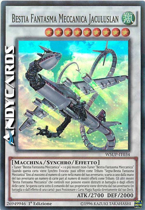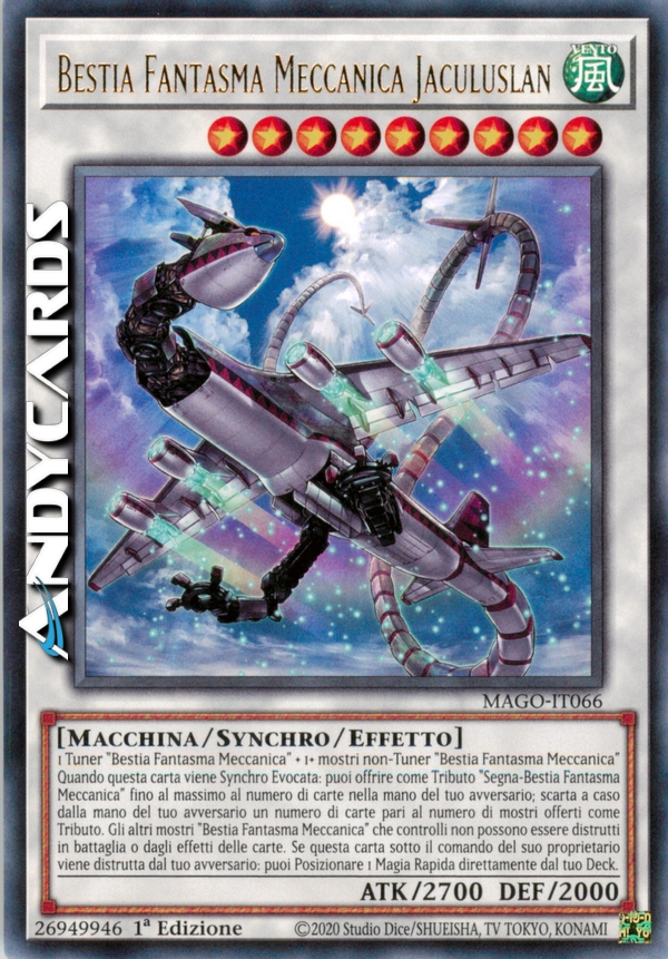 1 Tuner "Bestia Fantasma Meccanica" + 1 o più mostri non-Tuner "Bestia Fantasma Meccanica" - Quando questa carta viene Synchro Evocata: puoi offrire come Tributo "Segna-Bestia Fantasma Meccanica" fino al massimo al numero di carte nella mano del tuo avversario; scarta a caso dalla mano del tuo avversario un numero di carte pari al numero di mostri offerti come Tributo. Gli altri mostri "Bestia Fantasma Meccanica" che controlli non possono essere distrutti in battaglia o dagli effetti delle carte. Se questa carta sotto il comando del suo proprietario viene distrutta dal tuo avversario (in battaglia o dall'effetto di una carta): puoi Posizionare 1 Carta Magia Rapida direttamente dal tuo Deck.