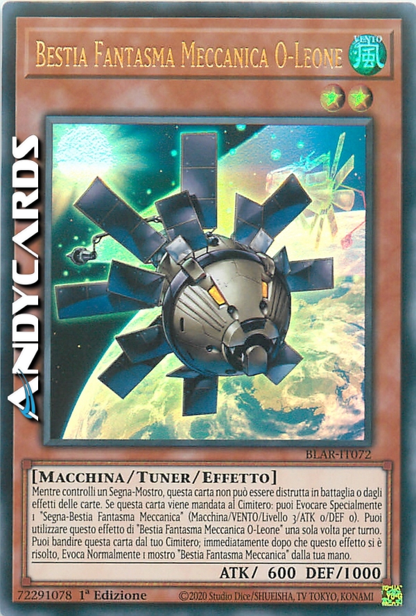 Puoi bandire questa carta dal tuo Cimitero; immediatamente dopo che questo effetto si è risolto, Evoca Normalmente 1 mostro "Bestia Fantasma Meccanica" dalla tua mano. Mentre controlli un Segna-Mostro, questa carta non può essere distrutta in battaglia o dagli effetti delle carte. Se questa carta viene mandata al Cimitero: puoi Evocare Specialmente 1 "Segna-Bestia Fantasma Meccanica" (Tipo Macchina/VENTO/Livello 3/ATK 0/DEF 0). Puoi utilizzare questo effetto di "Bestia Fantasma Meccanica O-Leone" una sola volta per turno.