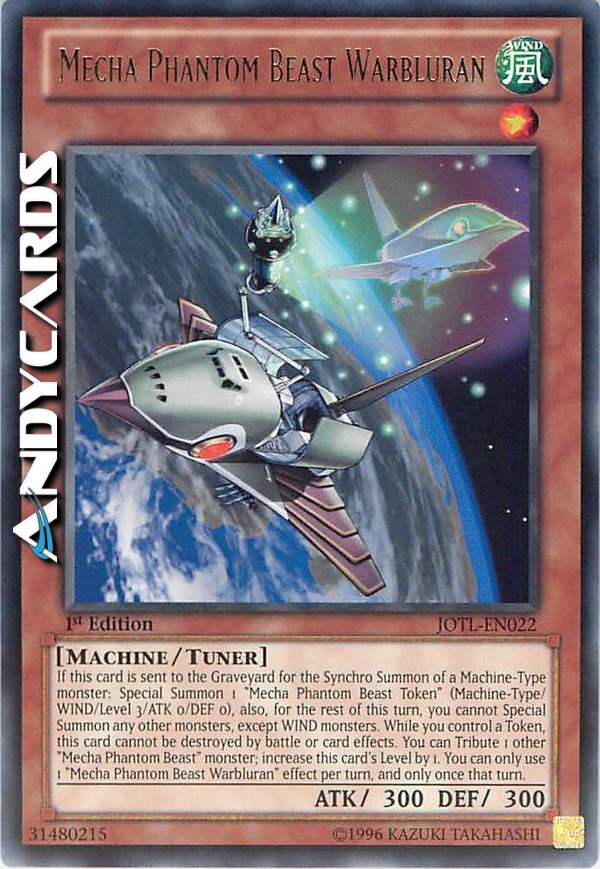 If this card is sent to the Graveyard for the Synchro Summon of a Machine-Type monster: Special Summon 1 "Mecha Phantom Beast Token" (Machine-Type/WIND/Level 3/ATK 0/DEF 0), also, for the rest of this turn, you cannot Special Summon any other monsters, except WIND monsters. While you control a Token, this card cannot be destroyed by battle or card effects. You can Tribute 1 other "Mecha Phantom Beast" monster; increase this card's Level by 1. You can only use 1 "Mecha Phantom Beast Warbluran" effect per turn, and only once that turn.