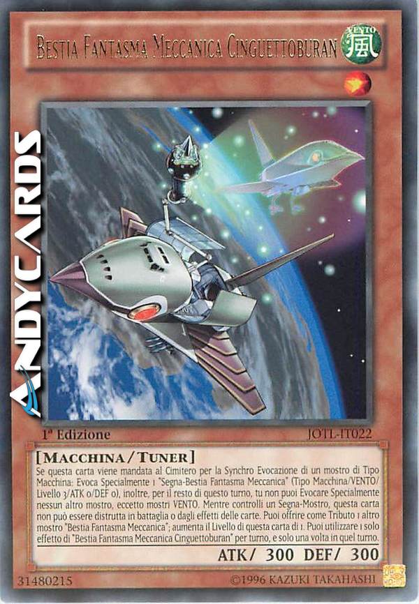Se questa carta viene mandata al Cimitero per la Synchro Evocazione di un mostro di Tipo Macchina: Evoca Specialmente 1 "Segna-Bestia Fantasma Meccanica" (Tipo Macchina/VENTO/Livello 3/ATK 0/DEF 0), inoltre, per il resto di questo turno, tu non puoi Evocare Specialmente nessun altro mostro, eccetto mostri VENTO. Mentre controlli un Segna-Mostro, questa carta non può essere distrutta in battaglia o dagli effetti delle carte. Puoi offrire come Tributo 1 altro mostro "Bestia Fantasma Meccanica"; aumenta il Livello di questa carta di 1. Puoi utilizzare 1 solo effetto di "Bestia Fantasma Meccanica Cinguettoburan" per turno, e solo una volta per turno.