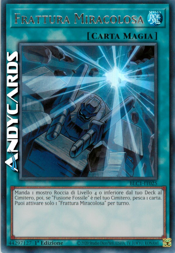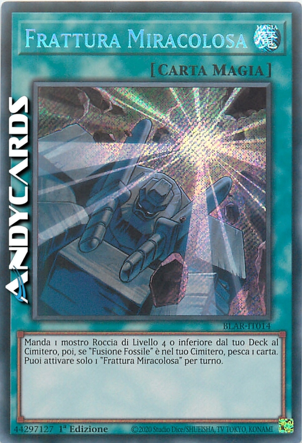 Manda 1 mostro Roccia di Livello 4 o inferiore dal tuo Deck al Cimitero, poi, se "Fusione Fossile" è nel tuo Cimitero, pesca 1 carta. Puoi attivare solo 1 "Frattura Miracolosa" per turno.