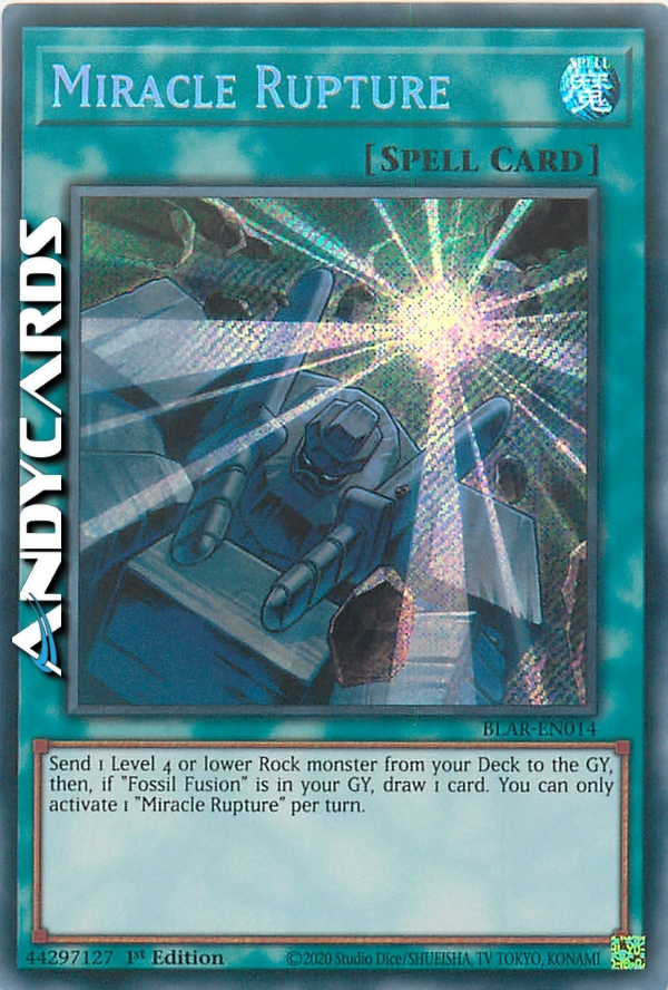 Send 1 Level 4 or lower Rock monster from your Deck to the GY, then, if "Fossil Fusion" is in your GY, draw 1 card. You can only activate 1 "Miracle Rupture" per turn.