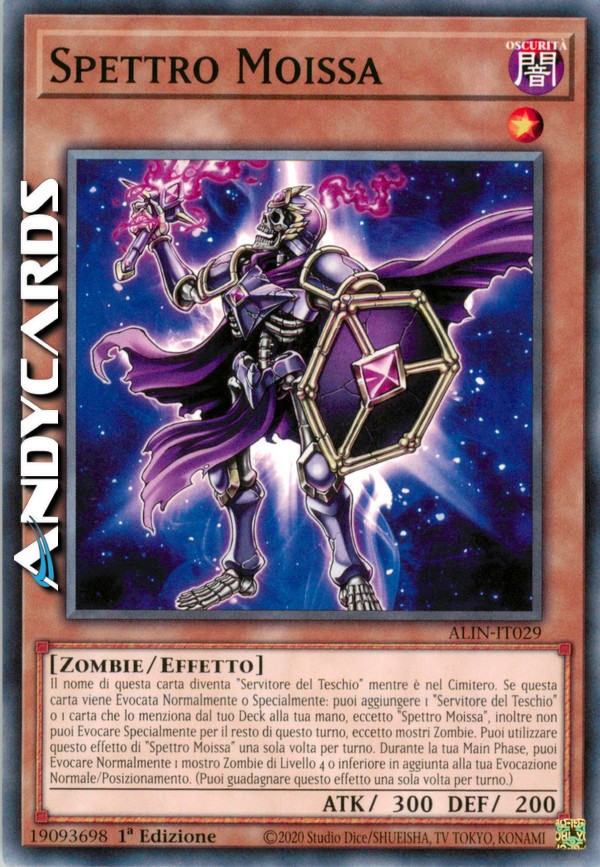 Il nome di questa carta diventa "Servitore del Teschio" mentre è nel Cimitero. Se questa carta viene Evocata Normalmente o Specialmente: puoi aggiungere 1 "Servitore del Teschio" o 1 carta che lo menziona dal tuo Deck alla tua mano, eccetto "Spettro Moissa", inoltre non puoi Evocare Specialmente per il resto di questo turno, eccetto mostri Zombie. Puoi utilizzare questo effetto di "Spettro Moissa" una sola volta per turno. Durante la tua Main Phase, puoi Evocare Normalmente 1 mostro Zombie di Livello 4 o inferiore in aggiunta alla tua Evocazione Normale/Posizionamento. (Puoi guadagnare questo effetto una sola volta per turno.)