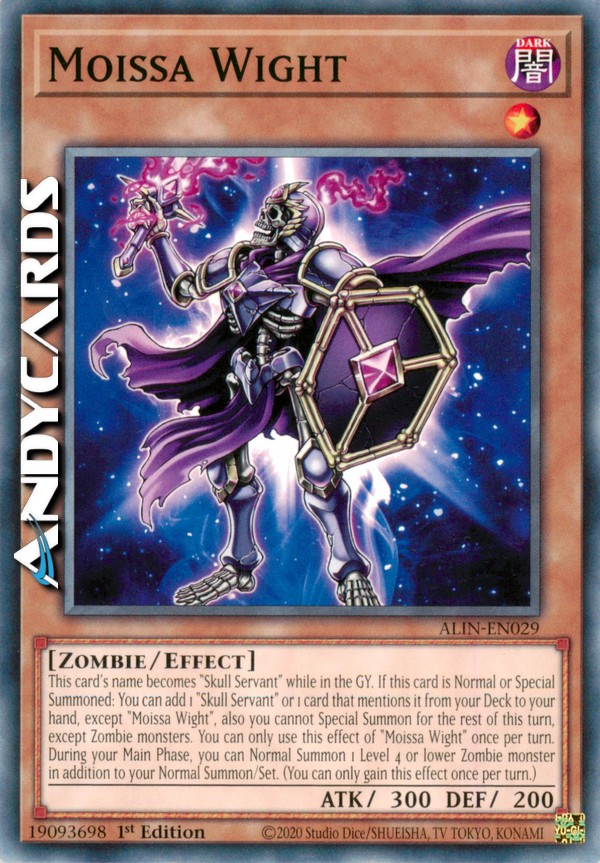 This card's name becomes "Skull Servant" while in the GY. If this card is Normal or Special Summoned: You can add 1 "Skull Servant" or 1 card that mentions it from your Deck to your hand, except "Moissa Wight", also you cannot Special Summon for the rest of this turn, except Zombie monsters. You can only use this effect of "Moissa Wight" once per turn. During your Main Phase, you can Normal Summon 1 Level 4 or lower Zombie monster in addition to your Normal Summon/Set. (You can only gain this effect once per turn.)
