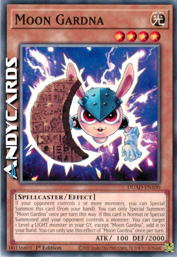 Se il tuo avversario controlla 2 o più mostri, puoi Evocare Specialmente questa carta (dalla tua mano). Puoi Evocare Specialmente "Gardna della Luna" una sola volta per turno in questo modo. Se questa carta viene Evocata Normalmente o Specialmente e il tuo avversario controlla un mostro: puoi scegliere come bersaglio 1 mostro LUCE di Livello 4 nel tuo Cimitero, eccetto "Gardna della Luna"; aggiungilo alla tua mano. Puoi utilizzare questo effetto di "Gardna della Luna" una sola volta per turno.