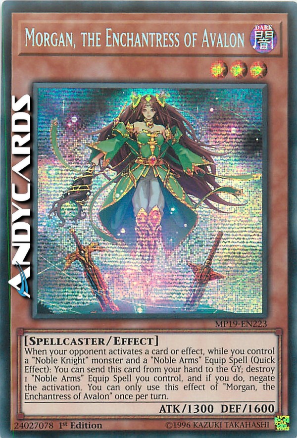 When your opponent activates a card or effect, while you control a "Noble Knight" monster and a "Noble Arms" Equip Spell (Quick Effect): You can send this card from your hand to the GY; destroy 1 "Noble Arms" Equip Spell you control, and if you do, negate the activation. You can only use this effect of "Morgan, the Enchantress of Avalon" once per turn.