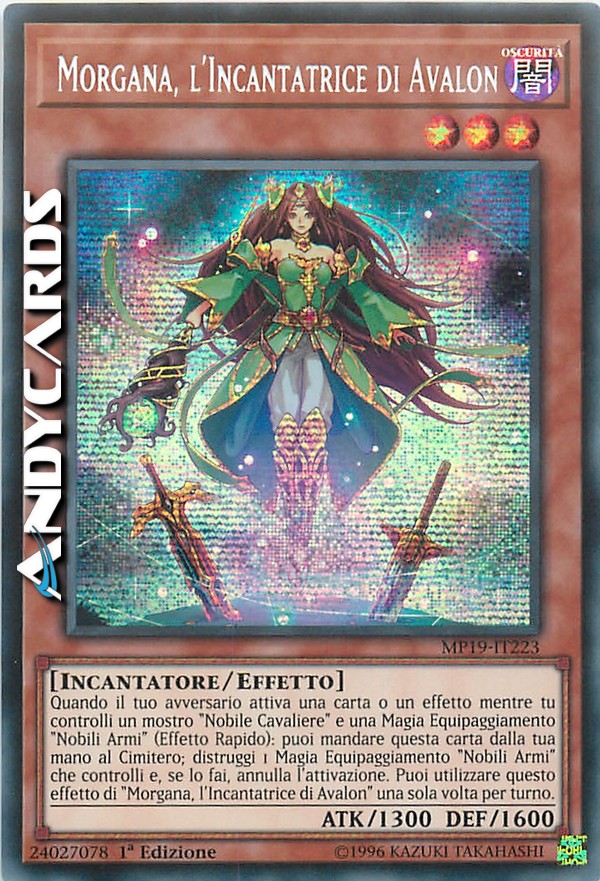 Quando il tuo avversario attiva una carta o un effetto mentre tu controlli un mostro "Nobile Cavaliere" e una Magia Equipaggiamento "Nobili Armi" (Effetto Rapido): puoi mandare questa carta dalla tua mano al Cimitero; distruggi 1 Magia Equipaggiamento "Nobili Armi" che controlli e, se lo fai, annulla l'attivazione. Puoi utilizzare questo effetto di "Morgana, l'Incantatrice di Avalon" una sola volta per turno.