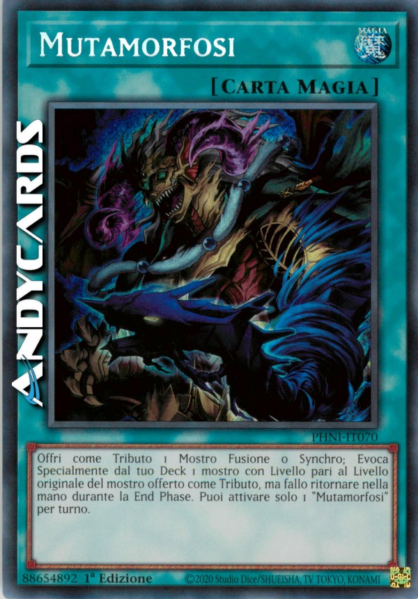 Offri come Tributo 1 Mostro Fusione o Synchro; Evoca Specialmente dal tuo Deck 1 mostro con Livello pari al Livello originale del mostro offerto come Tributo, ma fallo ritornare nella mano durante la End Phase. Puoi attivare solo 1 "Mutamorfosi" per turno.