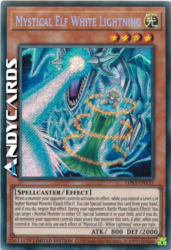 Quando un mostro controllato dal tuo avversario attiva il suo effetto, mentre controlli un Mostro Normale di Livello 5 o superiore (Effetto Rapido): puoi Evocare Specialmente questa carta dalla tua mano e, se lo fai, annulla quell'effetto. Durante la Battle Phase del tuo avversario (Effetto Rapido): puoi scegliere come bersaglio 1 Mostro Normale in qualsiasi Cimitero; Evocalo Specialmente sul tuo Terreno e, se lo fai, tutti i mostri controllati dal tuo avversario devono attaccare quel mostro in questo turno, se possibile, mentre tu lo controlli. Puoi utilizzare ogni effetto di "Elfo Mistico - Fulmine Bianco" una sola volta per turno.