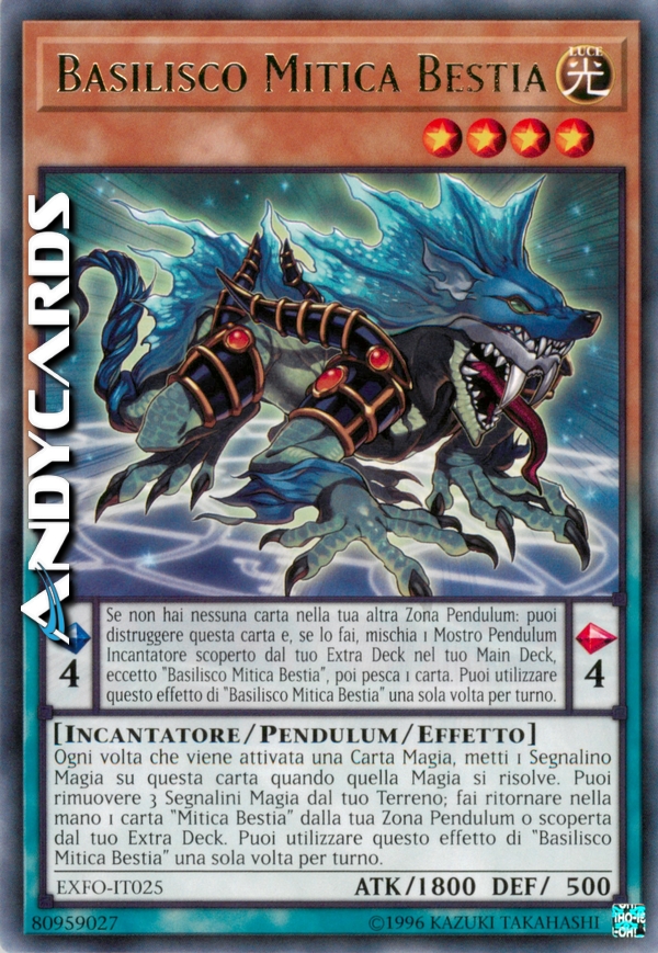 Ogni volta che viene attivata una Carta Magia, metti 1 Segnalino Magia su questa carta quando quella Magia si risolve. Puoi rimuovere 3 Segnalini Magia dal tuo Terreno; fai ritornare nella mano 1 carta "Mitica Bestia" dalla tua Zona Pendulum o scoperta dal tuo Extra Deck. Puoi utilizzare questo effetto di "Basilisco Mitica Bestia" una sola volta per turno.