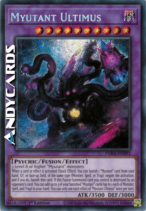 Quando viene attivata una carta o un effetto (Effetto Rapido): puoi bandire dalla tua mano, Cimitero o Terreno scoperto 1 carta "Myutante" dello stesso tipo (Mostro, Magia o Trappola); annulla l'attivazione e, se lo fai, bandisci quella carta. Se questa carta Evocata tramite Fusione che controlli viene distrutta da una carta dell'avversario: puoi aggiungere fino a 3 delle tue carte "Myutante" bandite (fino a 1 ciascuno di Mostro, Magia e Trappola) alla tua mano. Puoi utilizzare ogni effetto di "Myutante Ultimus" una sola volta per turno.