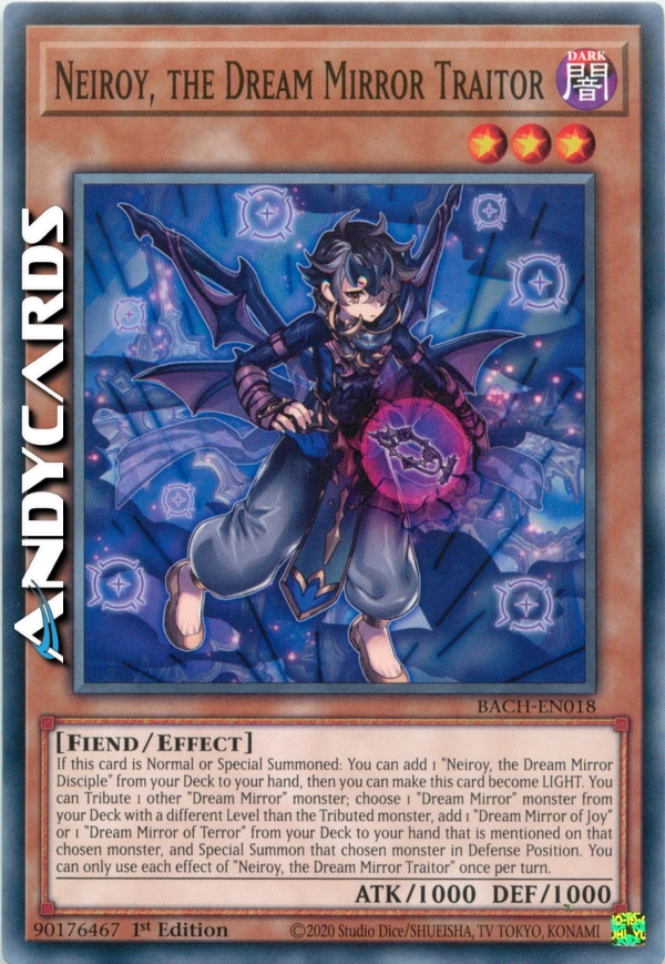 If this card is Normal or Special Summoned: You can add 1 "Neiroy, the Dream Mirror Disciple" from your Deck to your hand, then you can make this card become LIGHT. You can Tribute 1 other "Dream Mirror" monster; choose 1 "Dream Mirror" monster from your Deck with a different Level than the Tributed monster, add 1 "Dream Mirror of Joy" or 1 "Dream Mirror of Terror" from your Deck to your hand that is mentioned on that chosen monster, and Special Summon that chosen monster in Defense Position. You can only use each effect of "Neiroy, the Dream Mirror Traitor" once per turn.